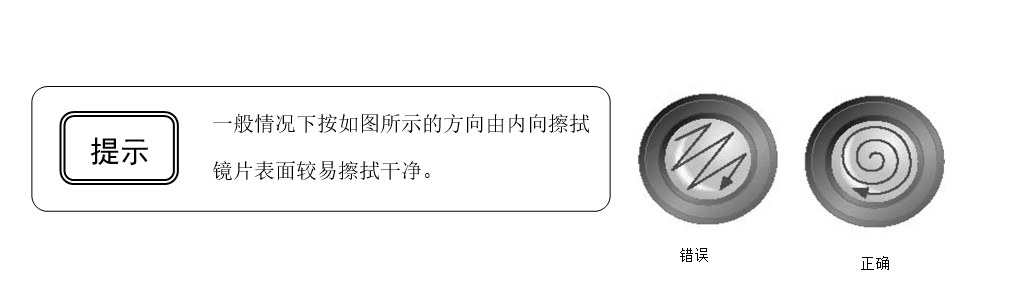 先用吹风球吹去或用软刷拭去镜头上的灰尘;重的污垢、指印可用镜头纸或软布蘸少许酒精与乙醚的混合液轻轻擦拭(两者混合比约酒精20~30%,乙醚70~80%),擦拭方法如下图: